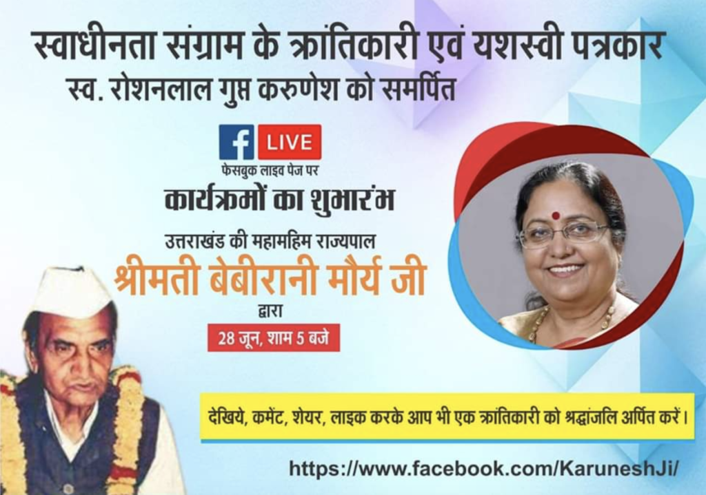 उत्तराखंड की राज्यपाल बेबी रानी मौर्य ने कहा है कि स्वाधीनता संग्राम सेनानियों की स्मृति को नमन कर के ही आज की युवा पीढ़ी को नई सोच, नया विचार मिल सकता है। बेबी रानी मौर्य रविवार को आगरा में स्वाधीनता संग्राम सेनानी स्व रोशनलाल गुप्त “करुणेश: के फेसबुक लाइव पेज पर “करुणेश परिवार” द्वारा प्रारंभ किये जा रहे “विस्मृत सेनानियों की याद” कार्यक्रम का उद्घाटन करते हुए पटल पर उपस्थित जनमानस को ऑनलाइन वीडियो के माध्यम से संबोधित कर रहीं थी।उन्होंने कहा कि स्वतंत्रता संग्राम सेनानियों ने राष्ट्र की आजादी के लिए जो संघर्ष किया उससे युवा पीढ़ी को बहुत कुछ सीखना चाहिए और प्रेरणा लेनी चाहिए। इससे उनको राष्ट्र के प्रति सम्मान का बोध होगा और साहस का संचार होगा जिसकी आज उनको बहुत आवश्यकता है। राज्यपाल ने स्वतंत्रता संग्राम व उसके उपरांत राष्ट्र व समाज को स्व रोशनलाल गुप्त करुणेश के योगदान व उनके जीवन संघर्ष का विस्तार से वर्णन किया। मेयर बनने के उपरांत 1996 में करुणेश से अपनी भेंट और उसके बाद उनके साथ कई मुलाकातों का जिक्र करते हुए राज्यपाल ने कहा कि उनसे मुझे बहुत प्रेरणा मिली और उनसे प्रेरित होकर मैंने समाज के लिए अनेक कार्य किए, महिलाओं के लिए, गरीबों के लिए अनेक कार्य किए। वह मेरे सच्चे प्रेरणास्रोत थे।प्रारंभ में राज्यपाल ने करुणेश के चित्र पर माल्यार्पण करके उनको श्रद्धा सुमन अर्पित किए। रोशनलाल गुप्त करुणेश परिवार ने विस्मृत सेनानियों व शहीदों को याद करने के लिए अभियान शुरू किया है। इस के अंतर्गत करुणेश जी के फेसबुक पेज पर प्रति रविवार को सायं 5:00 बजे देश के वरिष्ठ स्वाधीनता सेनानियों, कवियों, साहित्यकारों को पटल पर आमंत्रित कर केउनके विचारों का आदान प्रदान किया जायेगा, ताकि युवा पीढ़ी और अन्य सभी को भी उनके बारे में जानकारी प्राप्त हो सके।